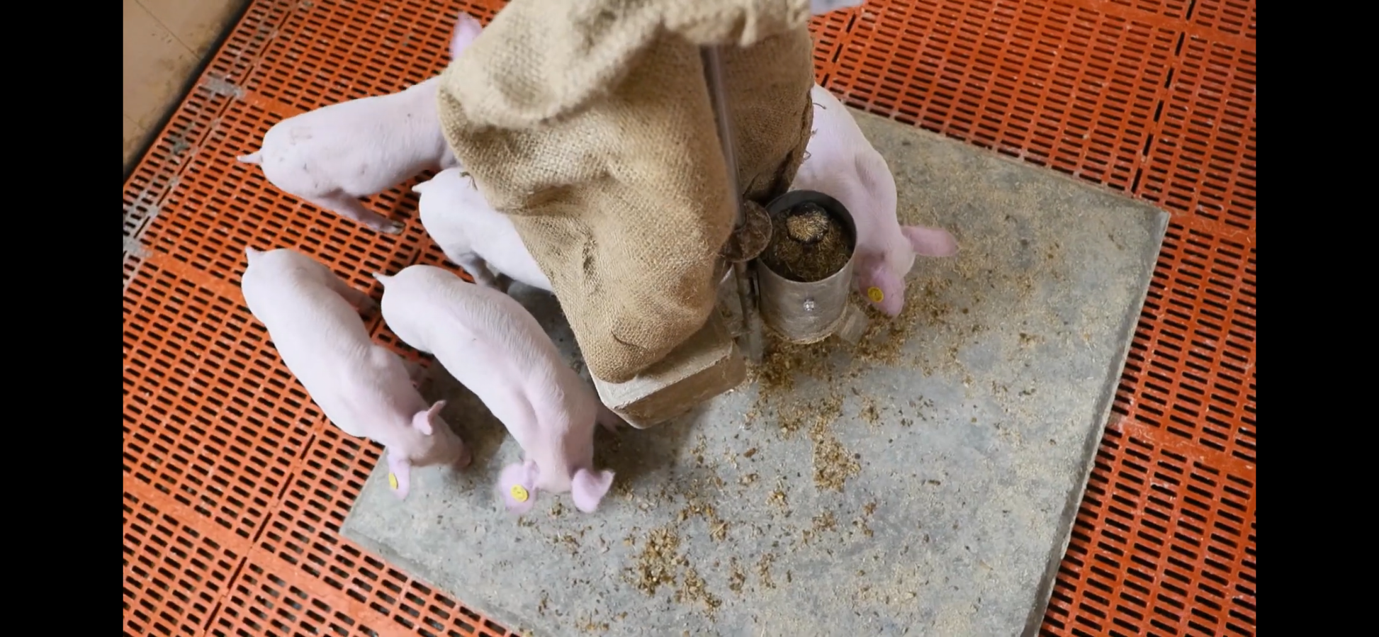 - Stimulering van wroetgedrag: Als de biggen spelen, komt het voer uit de koker op de dichte plaat, waar ze het direct kunnen eten of van de voerplaat kunnen oppakken, wat wroetgedrag bevordert.